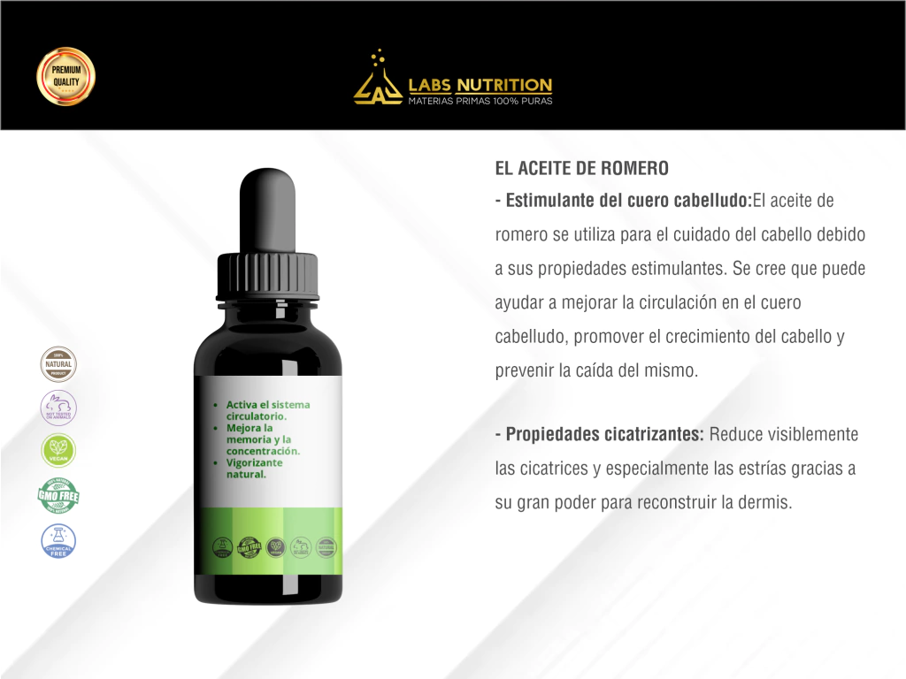-Estimulante del cuero cabelludo: El aceite de romero se utiliza para el cuidado del cabello debido a sus propiedades estimulantes. Se cree que puede ayudar a mejorar la circulación en el cuero cabelludo, promover el crecimiento del cabello y prevenir la caída del mismo.