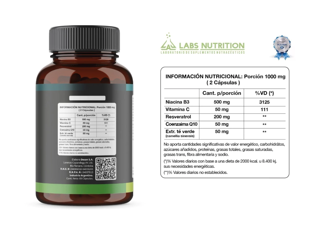NAD y resveratrol es la combinación ideal que se encarga de mejorar la reparación celular, aumentar la producción de energía y proporcionar una fuerte protección antioxidante reduciendo el envejecimiento celular.