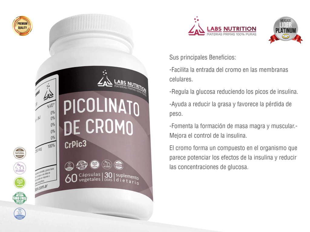 PICOLINATO DE CROMO es un compuesto que se elabora a partir del ácido picolínico y cromo, el ácido picolínico funciona como transportador para facilitar el acceso a las membranas celulares del cromo.